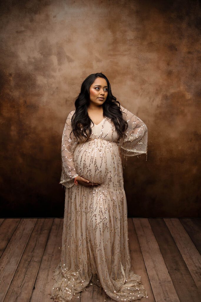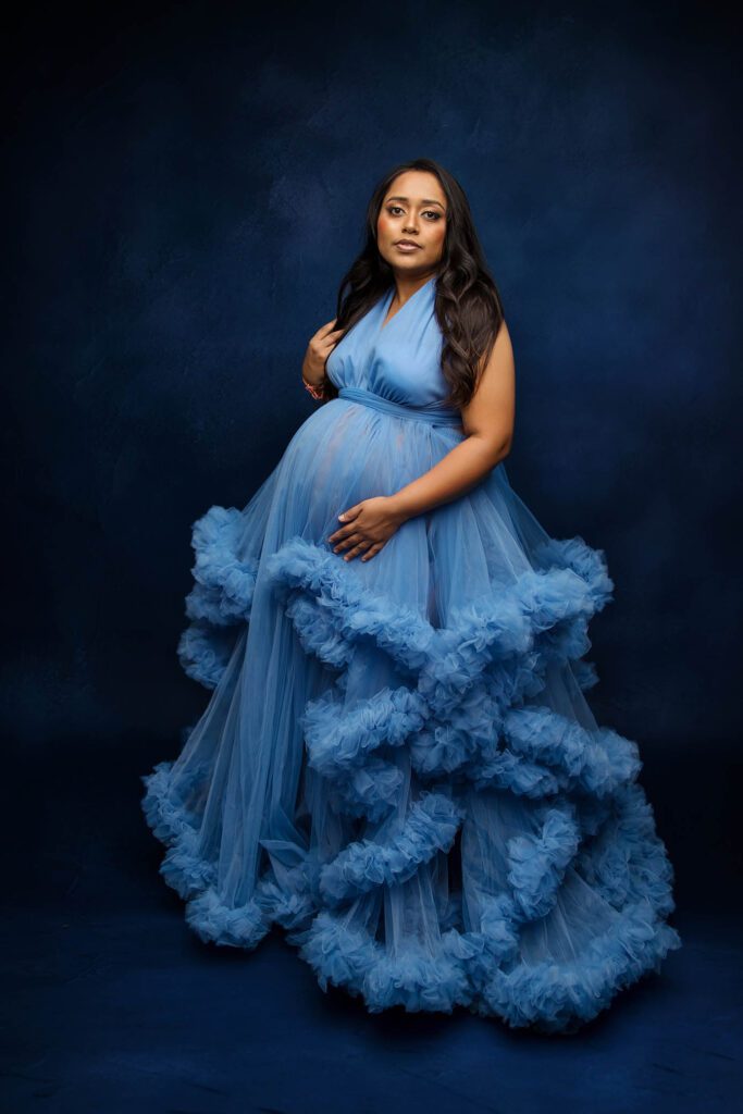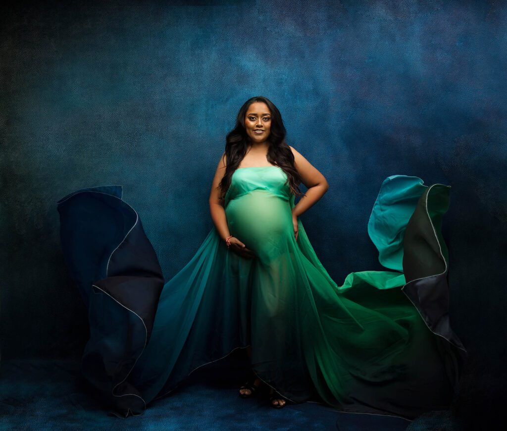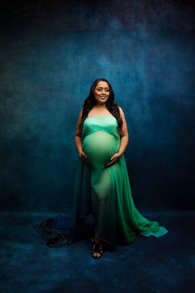 Before we began, Hiral picked out several maternity gowns from our studio collection. I chose matching backdrops that would highlight the colors and style she loved most. Everything came together perfectly!